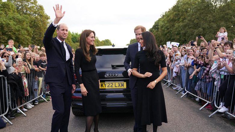 By all accounts, then, all eyes were on the two couples as they made their way to the gates of Windsor to pay their respects to Queen Elizabeth II and the mourners gathered outside. Body language experts were quick to weigh in on the head-turning occasion, with pro Judy James telling Express that while William boasted confidence and Catherine appeared a bit aloof, Harry and Meghan were consistently supportive of one another.
