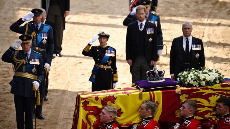 Many felt it was unfair, but they were on equal footing during the queen's coffin procession at the very least, with both Harry and Andrew pinning medals to their morning suits. Likewise, since they weren't allowed salute alongside the likes of King Charles and Anne, Princess Royal, the duo bowed their heads in solemnity, instead, per photos obtained by the Daily Mail.