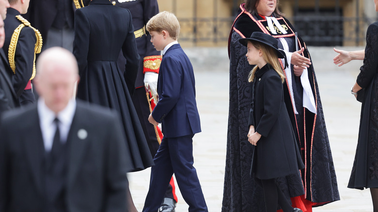 Both Prince George of Wales and Princess Charlotte of Wales walked behind the coffin of Queen Elizabeth II as it entered Westminster Abbey. For some who recalled the downcast faces of young Prince William and Prince Harry trailing behind the coffin of their mother decades prior, it hit too close to home. Taking to Twitter, one social media user wrote that their inclusion was, "Reminding me too much of Prince William and Prince Harry walking behind Diana's [coffin]. Did they not learn anything?" It bears mentioning that in the 2017 documentary, "Diana, 7 Days," the brothers addressed how difficult it was to trail behind their mother's coffin. William, Prince of Wales, described it as "One of the hardest things I've ever done" (via Us Weekly). He also reminisced on it being, a "long and lonely walk." Prince Harry, Duke of Sussex, meanwhile, told Newsweek, "I don't think any child should be asked to do that, under any circumstances."