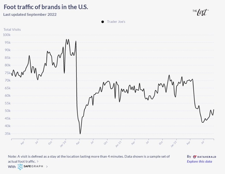 According to The List's graph, Trader Joe's has seen a few serious drops in the past few years. Pre-pandemic, the grocery store expected to see between 80,000 and 95,000 shoppers each month. As the store attempted to recover after the shutdowns in spring of 2020, foot traffic dropped by about 20,000 visitors. Trader Joe's saw another drastic dip in shoppers in April 2022, as inflation began to rise and shoppers had to make tough decisions about where they could afford to shop for their groceries.