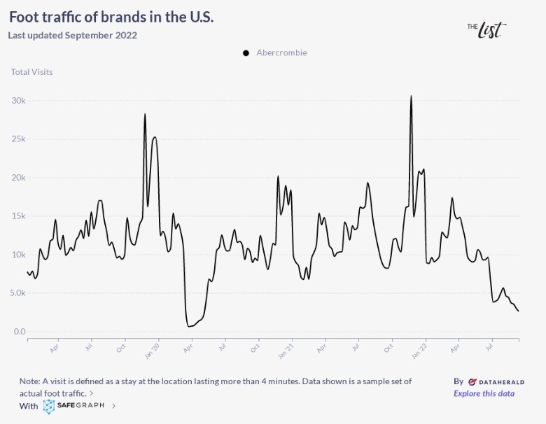 When new CEO, Fran Horowitz, took over in 2017, she implemented a number of business strategies including brand differentiation between Abercrombie & Fitch (A&F) and sister brand Hollister, as well as adopting a more sophisticated marketing approach (per Fortune). Many like Teen Vogue have lauded the changes, calling the brand "cool again." However, The List charted foot traffic data of U.S.-based Abercrombie stores via Safe Graph, and it unfortunately looks like the brand's sales may be taking a downturn.