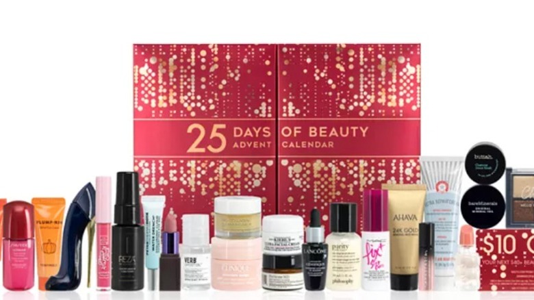 One of three advent calendars by Macy's, the 25 Days of Beauty Advent Calendar is by far the grandest, per Hello! Priced at $99 but valued at $277, its red and gold packaging will look gorgeous on your mantlepiece. It includes beauty stalwarts like Urban Decay and bareMinerals, as well as iconic skincare brands like Kiehl's, First Aid Beauty, and many more. There are also some in-demand high-value products included, like the miniature Estee Lauder Advanced Night Repair Synchronized Multi-Recovery Complex.