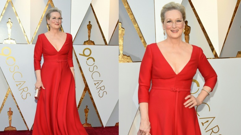 If red carpet royalty were an actual thing, there's no doubt that Meryl Streep would be our queen. The bonafide A-lister arrived to the 90th Academy Awards wearing an absolutely beautiful, bright red Christian Dior gown with a plunging neckline and belted waist. In early 2018, Streep broke her own record for most Oscar nominations ever when her performance in The Post earned the chameleon-like actress a 21st Oscar nod. After 21 nominations, you'd think the Academy Awards would be old news for Streep — but our queen looked as regal as ever as she walked the red carpet and posed for photographers, basking in the glow of her record-breaking nomination as if it were her very first.