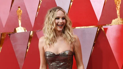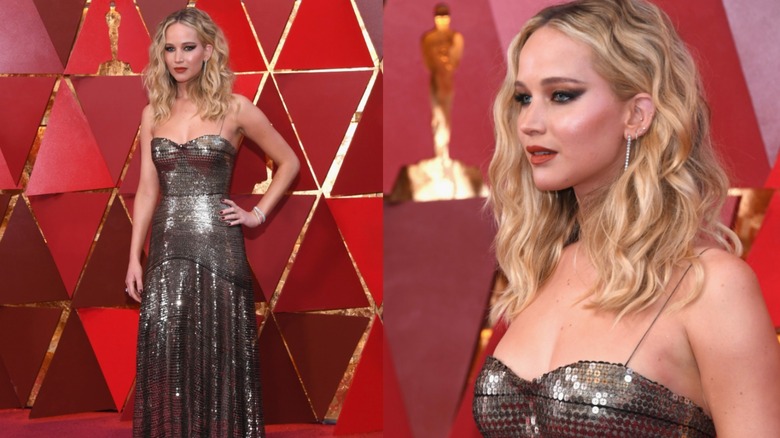 Jennifer Lawrence may not have been nominated for any Oscars at the 2018 Academy Awards ceremony, but the Red Sparrow starlet certainly could have passed for one of those golden statuettes in the metallic Dior number she donned for the evening's activities. Lawrence, known for her quick wit and entertaining red carpet interviews, sparkled in the sequined column dress with every step she took. As for jewelry, less was more for Lawrence, who opted to leave her neck bare and wear only a single diamond bracelet with her glittering ensemble.