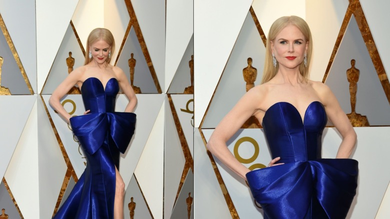 The dress featured a defined sweetheart neckline and mermaid silhouette, with a giant bow rounding out the front of the dress. However, the oversized bow was not the star of this show. How could that be true, you ask? Because Kidman's beautiful, blue ball gown had a leg slit that would put even Angelina Jolie's infamous 2012 Oscars dress to shame. The sky-high slit sat directly in the center of the gown, exposing the actress' long and lean gams. This kind of gown requires a special, immensely graceful, kind of person to successfully wear without incident — and the ever-elegant Kidman was the perfect gal for the job.