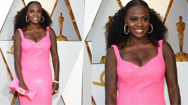 With some help from celebrity stylist Elizabeth Stewart, Davis was serving up some serious Barbie girl vibes in the floor-length, sequined gown featuring a plunging sweetheart neckline and a matching hot pink Roger Vivier clutch. A pair of diamond hoop earrings from Norman Silverman completed the ensemble and confirmed once and for all that, yes — hoop earrings are most definitely making a comeback in a major way. Davis' Oscars aesthetic is totally keeping the dream of the 90s alive in all its hot pink, glittery glory.
