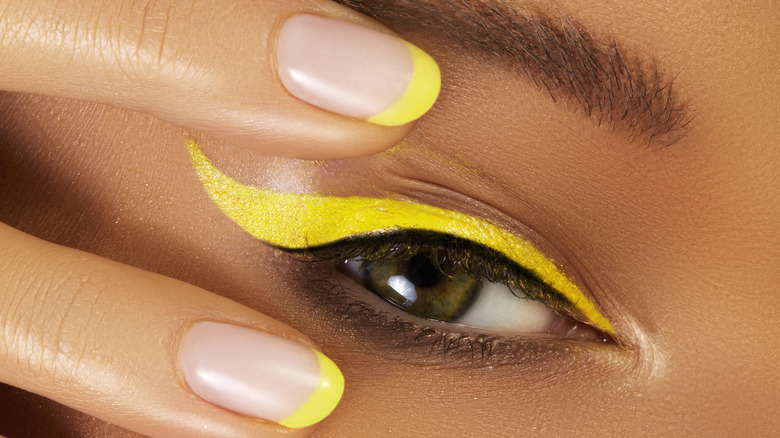 In a stunning revival of the bold and bright decade of 1980s makeup, neon pops and bright colors are back in business. All you need to elevate your look anymore is a single brush of flamboyant eyeshadow or animated eyeliner detailing. Graphic makeup has never been for the faint-hearted, but since its colorful comeback, driven by social media trends and the influence of makeup artists, it has taken more people into its embrace. "Whether you are expressive with makeup or are more shy, or perhaps stuck in a makeup rut, you can gain confidence and expression through a colorful eyeliner," celebrity makeup artist Molly R. Stern advises (via W Magazine). Go on, bring out your reds, yellows, lilacs, and blues.