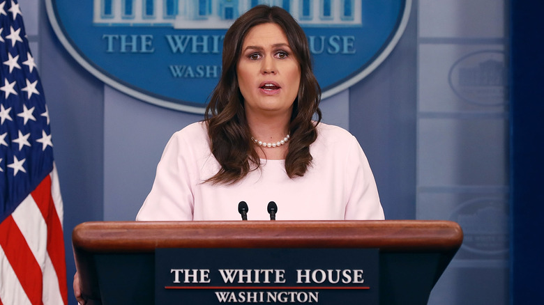 To say that Donald Trump's time as president — both as a candidate and then as a holder of the office — was controversial is a serious understatement. A cursory search on the internet brings up a number of his choice words, acts, and enemies that all collectively built his political brand, and Sarah Huckabee Sanders was with him every step of the way, no matter the issue (via Pew Research Center). Replacing Sean Spicer in July 2017, Sarah held the job for about two years, which is a pretty good shelf life for a press secretary — though, as noted by the BBC, she famously held few press briefings and was seen as "combative" when she did engage with members of the print, digital, and broadcast media.