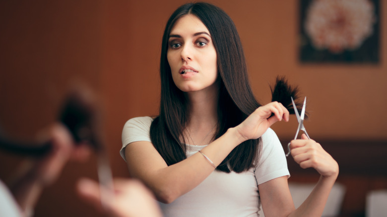 And be sure to properly protect your hair from heat, especially if you regularly rely on blow-dryers and straightening irons. Even if you're super careful, you'll likely notice at least a few split ends over time. To keep them in check, hairstylist Jonathan Colombini suggested dusting every eight to ten weeks (via L'Oréal Paris). When you're ready to get rid of more length or want a new style, head to the salon instead.