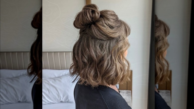 A classic way to wear the half-up, half-down hairstyle involves keeping the strands down for a ponytail look. But why not create a loose and tousled top knot, as seen in this Instagram post by @gemmanicholshairandmakeup? This style has a relaxed vibe with wavy, soft ends, but you could sleek the top for a more polished look if preferred. "When you can't decide between a top knot or a half-up style, we give you both," the caption reads. The best of both worlds!
