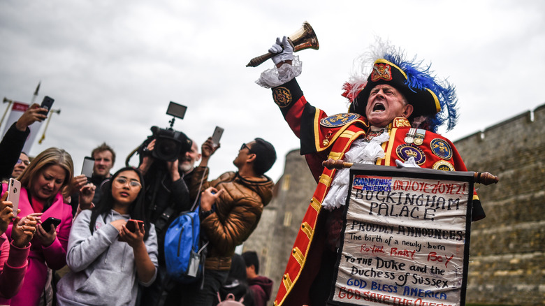 Before social media, the palace was the sole announcer of royal births. Even though royals now have social media at their disposal, this tradition is still upheld. According to British Heritage, the palace officially announces the birth of a royal baby by placing a golden easel in its forecourt. The easel contains a framed document announcing the baby's birth, which is traditionally signed by the royal doctors who helped deliver the baby, People reports. In addition to the easel being put on display, the palace also still honors the age-old tradition of having the town crier announce the details of the baby's birth to the crowds gathered outside the hospital (via Style).
