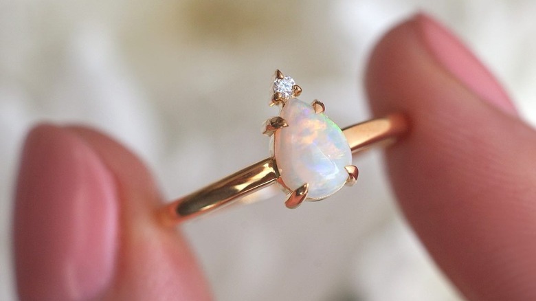Opals are formed when rainwater evaporates from underground rocks and leaves behind silica. Aesthetically speaking, opals are incredibly distinct. Misa Hamamoto noted, "For the untraditional non-diamond bride, opals make the perfect engagement ring because they display a different kind of sparkle than a diamond — a magical, iridescent sparkle." So, what's the catch with opal engagement rings? For all their beauty and affordability, they are perhaps not the best choice to be your forever ring. Unfortunately, they can break and scratch easily. For this reason, they are not recommended for everyday use. In fact, they are as fragile as glass (via Frank Darling).