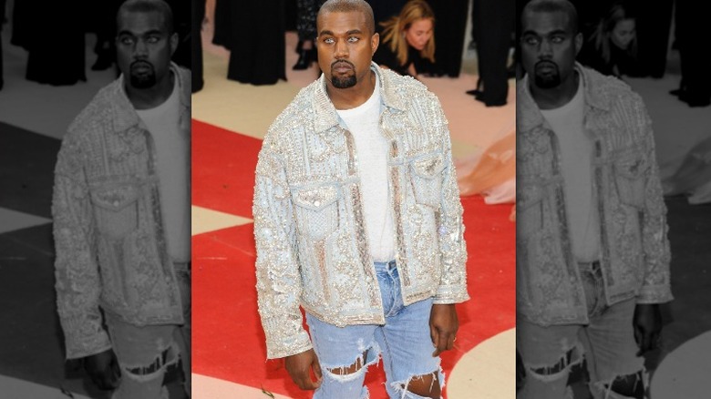 Back in the old days when he didn't make headlines for beefing with the Kardashian-Jenner clan, Kanye West used to set off buzz about his fashion choices. In a particularly unforgettable style statement from the annals of fashion fails on the Met Gala red carpet, Ye arrived in a hard-to-categorize ensemble in 2016. He was a study in contrast with a lavishly bejeweled Balmain jacket adorning his upper half and garden-variety ripped denim (that cost $900, by the way) trailing down to his ankles.