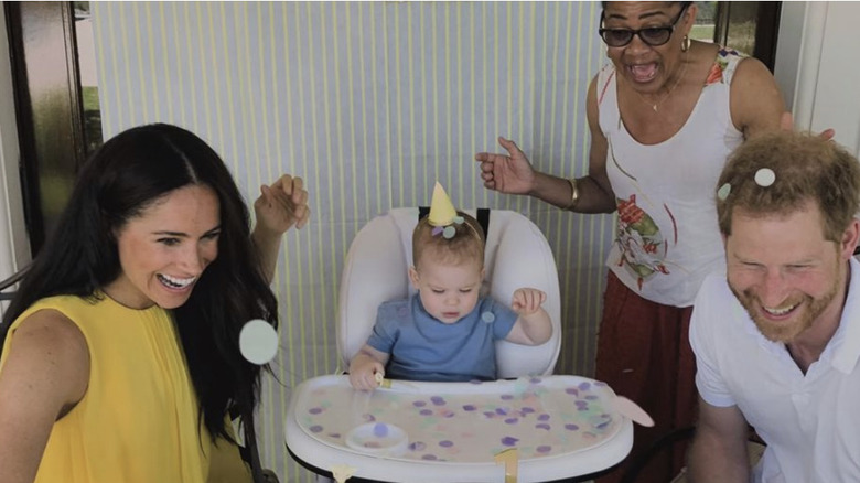 Back in 2020, Meghan Markle started a tradition of home birthday parties for her children when Prince Archie turned 1. Due to COVID restrictions that year, the celebration was very small and included Prince Harry, Meghan, Archie, and Meghan's mom, Doria Ragland. Viewers of the Netflix docuseries, "Harry & Meghan" got to see footage of the birthday boy wearing a small birthday hat and sitting in a confetti-decorated highchair.