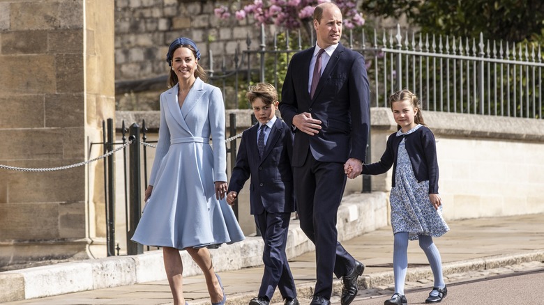 Like many mothers around the world, Princess Catherine sees Easter as the perfect opportunity to dress her children in precious pastels. In 2022, the Princess of Wales matched with her two eldest children, Prince George and Princess Charlotte, at an Easter church service near Windsor Castle, with mom, son, and daughter all dressed in gray-blue formal wear. Catherine paired her princess cut dress with a darker blue headband, while Charlotte dressed in a light blue patterned dress and midnight blue cardigan. George carried on the color story with a light blue buttoned shirt underneath his smart navy suit.