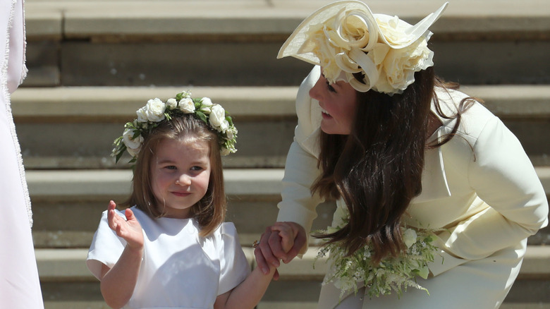 All the world was watching Meghan Markle wed Prince Harry on May 19, 2018. If you were one of the millions of viewers to tune in, you probably spotted Princess Catherine in her cream-colored coat dress with a young Charlotte at her side. As one of Meghan's bridesmaids, Charlotte was wearing a short-sleeved white dress paired with a flower crown composed of lily of the valley. While her mother's dress was more pastel yellow in color, the royal pair did match in the floral department, with Catherine also carrying a bouquet of lilies of the valley.
