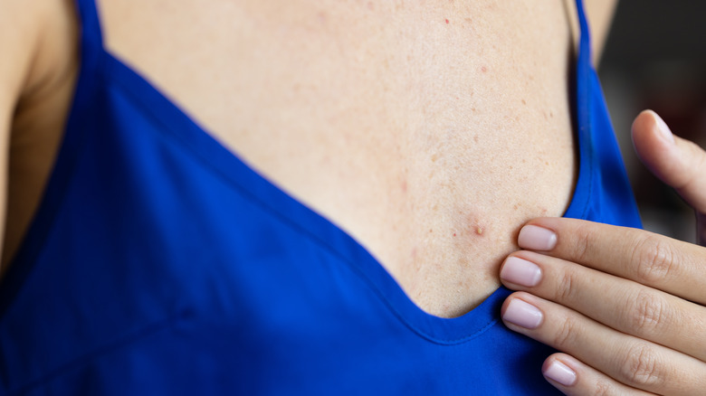 Although it's common to sweat around your breasts, especially during a workout or any physically-demanding activity, if you notice consistent breakouts or pimples in the general bra area, you might be wearing an undergarment that's too tight and constricting, or you're wearing a material that isn't breathable.