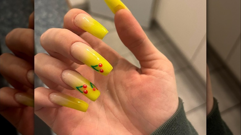 Sometimes a French manicure on a long nail can look a bit off. However, the faded French manicure fits right in on those super-long styles. The way the tip melds right into the pink of the base is a true sight to behold. However, @nailedbystesh takes the faded French manicure into deliciously new territory by adding a neon yellow tip and cherries on the middle and ring fingers. The bright yellow brings the tip to full attention while the cherries add a bit of playful fun to this square nail art.