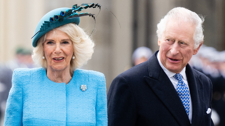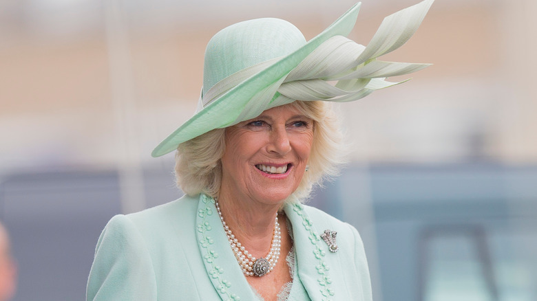 The substantial pin is a favorite of Camilla's, as she's worn it frequently through the years and most often when visiting Scotland. Though its precise origins are unknown, there is some speculation that it came from the vault of Margaret Greville. The famed socialist left her entire collection of jewelry to the royal family, evetually becoming the possession of Queen Elizabeth II, but it's assumed the diamond thistle brooch was specifically given to The Queen Mother at her request since she was seen wearing it the most (via 9Honey).