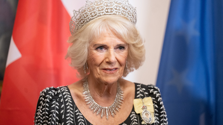 To complete the look, Camilla also wore the matching sapphire bracelet and tiara, both of which were commissioned by Elizabeth in 1963. The tiara was crafted from a necklace made with diamonds and sapphires that once belonged to Belgium's Princess Louise. Elizabeth wore the accent for state dinners and for her Canadian portrait in 2020 (via People).