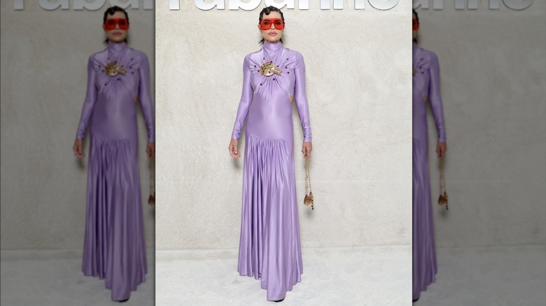We have to give Lisa Rinna credit where credit's due: she really pushed the boundaries of style during Paris Fashion Week, unlike most celebrities in attendance who played it safe with fashionable yet somewhat boring looks. However, her ensemble for the Rabanne runway show was not one of our favorites. Let us start by recognizing that the lilac color of her gown is beautiful, and we like her retro orange glasses and 1920s-inspired hairstyle. Those are certainly elements of the "Real Housewives of Beverly Hills" alum's bold look that were strong choices.