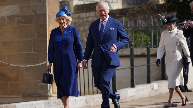 If you looked closely, you could also spot the more intricately embroidered patterns trailing down Camilla's commendable classy look. The future queen consort paired this ice blue ensemble with a matching clutch bag, gold bracelet, and her own sizeable wedding ring. She and her new husband Prince Charles doubled down on their newlywed status, with Prince Charles also wearing a silver suit and light blue tie for the occasion.