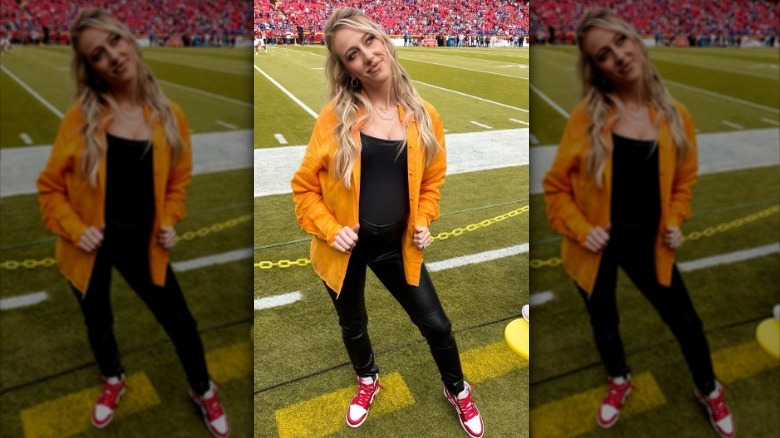 We get it, yellow is one of the Kansas City Chiefs' team colors. And yes, Brittany Mahomes has certainly made the bright and sunny hue work at other games. Alas, this goldenrod and black outfit did not have us buzzing. When the Chiefs went up against the Buffalo Bills in October 2022, Mahomes donned a bright yellow shirt along with black leather pants and a pair of red and white Nikes. She dressed her daughter in a matching look; "My twin girl," she wrote on Instagram. While the ensemble was definitely a nice nod to her husband's team, as an outfit it wasn't exactly her best. In fact, we couldn't help but be reminded of a bumblebee or a big sunflower.