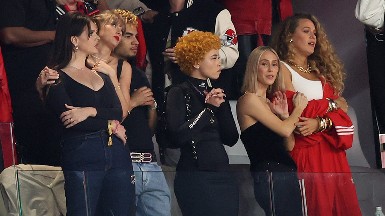 If you think Taylor Swift came in full cheerleader mode, wait until you check out her squad. Thanks to the NFL's official account on X, formerly known as Twitter, we know that the pop star arrived with Blake Lively and Ice Spice. We also caught the "60" on her jacket — a subtle nod to the Chiefs' founding year, perhaps? We've got to point out Swift's earrings, twinning with Kelce's in a clear sign that these two are in sync.