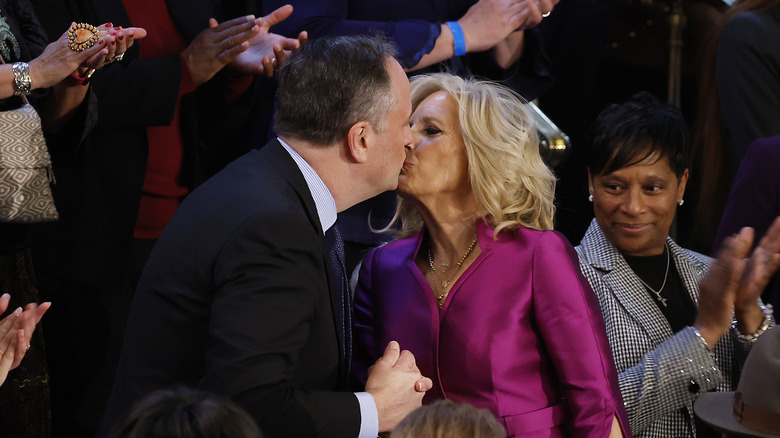 It's been over a year since Jill Biden and Kamala Harris' husband, Douglas Emhoff, shared a kiss that rocked the SOTU. During the 2023 State of the Union address, Jill stopped to exchange pleasantries with Emhoff and kissed him on the lips. While cheek kisses and pecks are certainly not unusual, lip kisses among two people who aren't romantically involved certainly are. Consequently, the pair had eyes on them during the SOTU 2024. However, his time, Jill walked in, waving to everyone as she had the last time — but she didn't exchange personal greetings with Emhoff or anyone else.