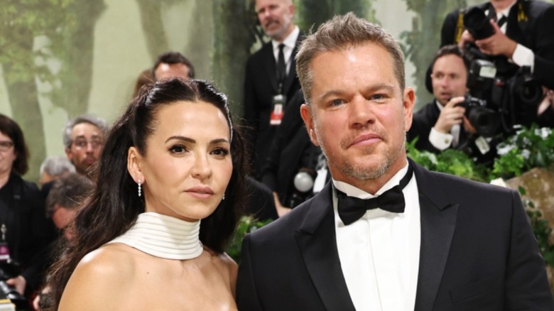 Matt Damon and Luciana Barroso both wore Dior for the 2024 Met Gala. Like many men who attend the prestigious fashion event, Damon played it safe with a black tuxedo. Barroso's look was on the simple, understated side as well. She wore a strapless column dress in white with a matching scarf and was the picture of elegance. "The Garden of Time" was the dress code, a reference to the J.G. Ballard short story. The dress code inspired a lot of flora-inspired outfits, such as the seemingly ageless Demi Moore's eyebrow-raising look. Although Barroso and Damon's outfits weren't directly flower-related, Glamour posited that Barroso's white gown could be reminiscent of calla lilies.