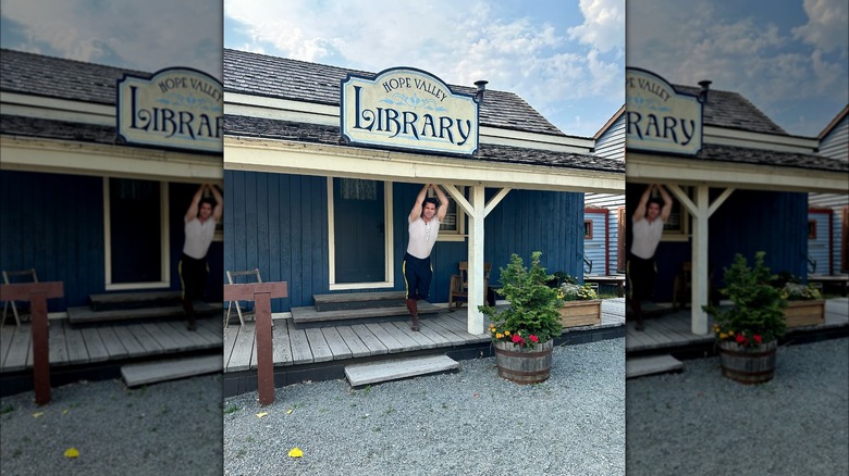 The swoon-worthy snapshot shows McGarry in front of Hope Valley Library, reaching his arms up to lean against the beam of the front porch. The position, along with his short-sleeved top, shows off his muscular arms in a way that the comment section loved. "#Suspenderless unbuttoned," the Hallmark star wrote under the photo.