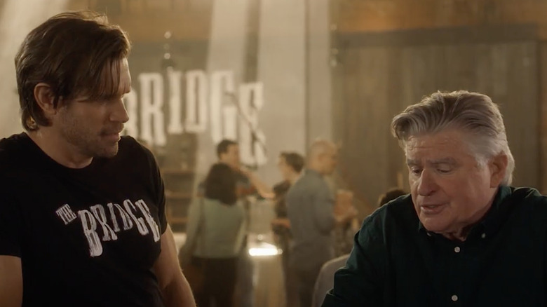 In addition to being a regular on "Chesapeake Shores," actor Stephen Huszar (shown above with Treat Williams and the series' location manager Priscilla Yeo) has appeared in multiple Hallmark romance movies. You might have seen him in, among other productions, "Love in Glacier National: A National Park Romance," "Undercover Holiday," and "A Royal Christmas Crush," where Huszar took his onscreen romance with co-star Katie Cassidy offscreen for a real-life love story. Although Huszar worked with Williams on "Chesapeake Shores" for two years, across more than 15 episodes, it wasn't nearly enough.