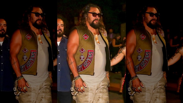 Beyond his physique, Momoa also seems to be leaning into his divorced dad look with his fashion. The "Game of Thrones" star wore a khaki vest that was covered in bold patches. He layered it over a beige tank top that appeared to have a stain on it, paired with distressed khaki pants. Momoa also accessorized with brown boots, dark sunglasses, and plenty of jewelry, including an oversized tooth necklace. You can check out his look below.