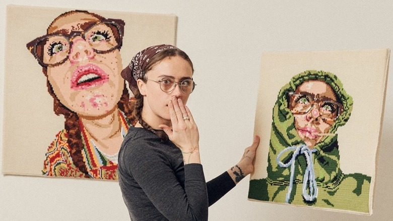 Beyond her yarn creations with Batsheva Hay, Ella Emhoff has showcased her artistry on two Instagram accounts, @ellaemhofflikestoknit and @ellaemhoff. She's been knitting since age six, and, as an adult, Ella's created pants, sweaters, hats, and dresses, including one vibrant striped creation made of leftover yarn. In addition to apparel, Ella creates knit paintings. Using a technique called overstitching, Ella takes a needle and yarn to create intricate designs in an already knitted piece of material. She's created pictures of popular cartoon characters like Donald Duck, as well as multiple self-portraits. In April 2024, Ella even exhibited some of her knit paintings in a New York gallery.