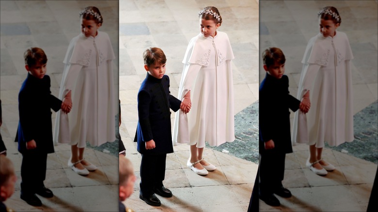 Some royals love borrowing clothes from their mom's closet. When she gets a little older, we can certainly picture Princess Charlotte swapping garb with her elegant mom, Princess Catherine, but for now the youngster will have to make do with mini versions of her mother's fits. Attending Easter service at Windsor Castle in 2022, Charlotte and Catherine had a cute twinning moment. Catherine wore a chic powder blue coat dress with a full skirt, evoking Cinderella's ballgown. Meanwhile, her 6-year-old mini-me sported a floral dress in the same shade, with matching colorful tights.