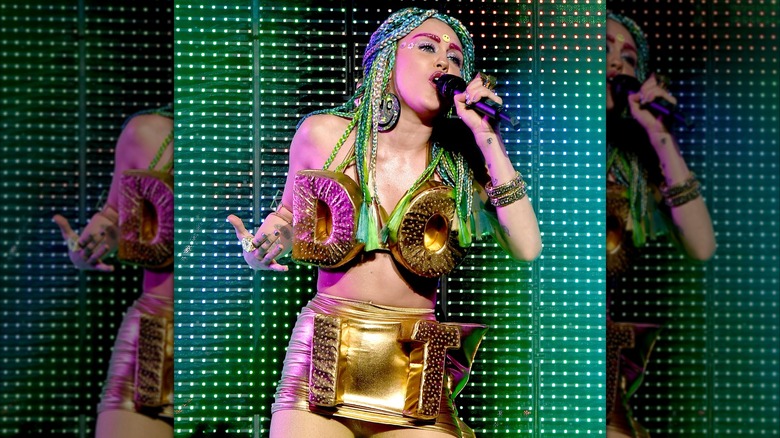 At one point in the show, she wore a green, blue, and silver braided wig, and she also seemed to have dyed pink eyebrows along with stickers on her face. Cyrus' outfit for that portion of the show was a gold top and miniskirt set adorned with the phrase "DO IT." She also wore looks such as a mirrored, disco-ball-like jumpsuit with a matching helmet.