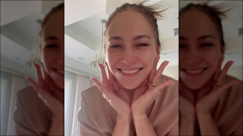 In 2023, Jennifer Lopez went makeup-free on Instagram again. In a video shared to her and JLo Beauty's accounts, the star flaunted her bare skin and talked fans through the four-step beauty routine she called "The Bronx Goddess Glow." She began by applying her JLo Beauty That JLo Glow Serum, then used her JLo Beauty That Blockbuster Hydrating Cream, JLo Beauty That Fresh Take Eye Cream, and JLo Beauty That Star Filter Complexion Booster (plus the same product in Pink Champagne as highlighter). The beauty added a touch of lip gloss and mascara — not that she needed it. Even without the most basic cosmetics, Lopez's skin looked illuminated from within. There wasn't a single blemish or dark spot on her face and even her brows were full and fluffy. But we love that Lopez wasn't afraid to show off the acute fine lines under her eyes, which are totally natural and proved she's had plenty to smile about.