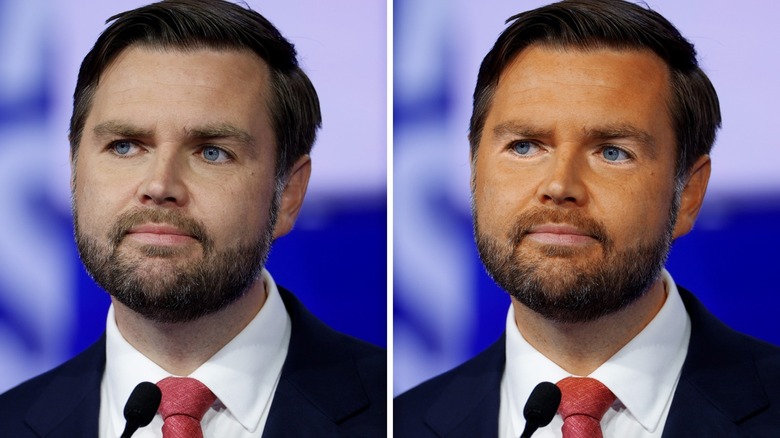 It's no secret that Vance and Trump both share a penchant for caking on makeup. For Vance, it's his dark eyeliner, and for Trump, of course, it's his boldly unnatural foundation. We're so used to seeing Trump painted to look like a jack-o-lantern that it's easy to forget just how odd this choice really is. But, how would Vance look if he, too, orange-ified himself? Well, thanks to some exclusive photo editing by the Static Media photo team, we've got the answer. And, as you might expect, it's pretty strange, but there's something utterly fitting about it.