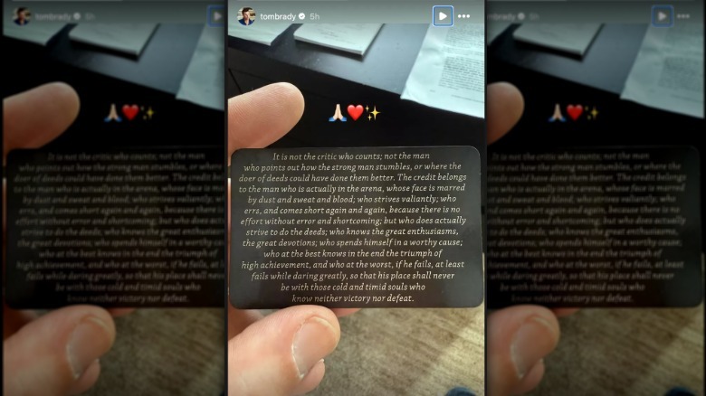 If the song choice was intentional, Brady is doing a lot to prove he's over his ex, but if he's posting about it, that means the football star is still thinking about her. Brady posted a different, yet equally suspicious message on his Instagram Stories in November 2024, when he snapped a photo of a card with a quote from Former President Theodore Roosevelt's famous 1910 speech "The Man in the Arena." The lengthy quote, in summary, refers to the importance of action, compared to lazy critics. It even inspired the title of the ESPN documentary "The Man in the Arena: Tom Brady," as the man himself confirmed on X, formerly known as Twitter. Suffice it to say that quotes about finding strength in adversity don't exactly scream: "I'm over you."