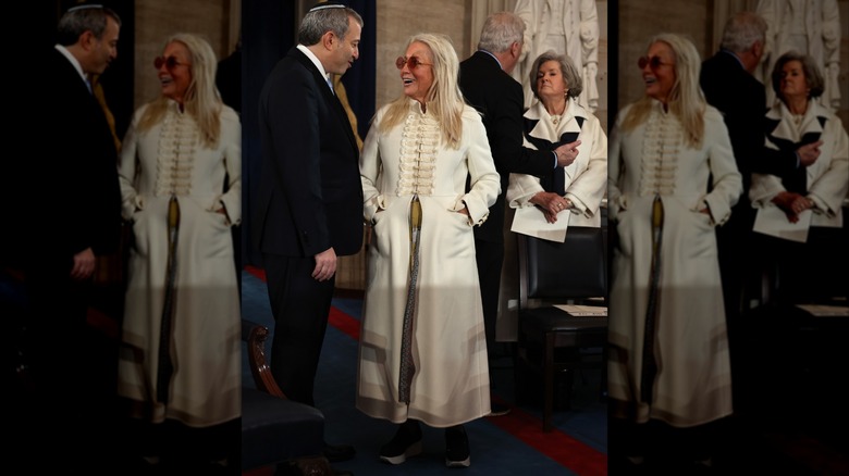 For a reason we'll never know, Israeli-American physician Miriam Adelson showed up to the inauguration in an ensemble that looked like a cross between a Ghost of Christmas Past costume from a community theatre production of "A Christmas Carol" and a last-minute John Lennon cosplay. Needless to say, it was a baffling choice, but her apparent decision not to brush her hair was really the cherry on top of this entirely awful look.