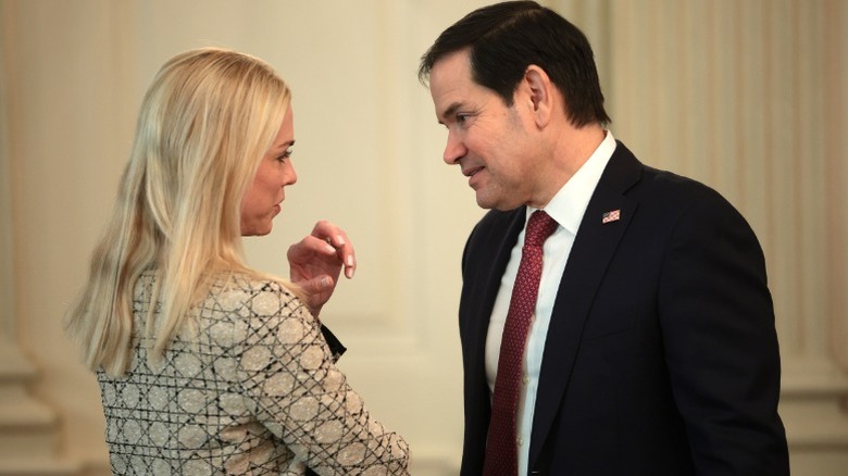 While attending the Governors Working Session at the White House, Attorney General Pam Bondi was seen rubbing elbows and chatting up fellow members of Donald Trump's administration. Seen here speaking with Secretary of State Marco Rubio, Bondi accidentally had her back turned toward the camera, and was caught showing off her rookie mistake. The stiff and almost crimped appearance of the back of her hair suggests that Bondi possibly ran out of time to completely straighten her hair, or might lack the experience to remember to finish the task properly.