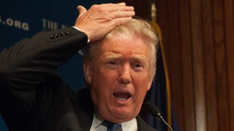 Donald Trump has accidentally confirmed his biggest insecurities on multiple occasions. The divisive leader showed the whole world just how much he wants them to believe his hairdo is the real deal when Trump invited a woman to inspect his mane to confirm its authenticity during a 2015 rally in Greenville, South Carolina. "It's my hair!" the former "Apprentice" host proudly proclaimed in response to a New York Times article in which Spanish journalist Ricardo Sánchez dubbed him "the man of the toupee," (via CBS News). "You have to do an inspection, this is getting crazy," Trump informed the unsuspecting woman, who awkwardly confirmed to the crowd that his mane appeared to be authentic.
