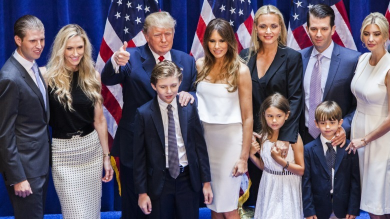 The Trump men are known for their overblown egos, infidelity, and an incessant obsession with their hair. That last one shouldn't come as a surprise considering, even before Donald Trump took office for the first time in 2016, pictures of him and his adult sons hinted that they'd inherited the president's hair woes. A 2015 photograph showing the entire Trump clan posing proudly with their kids put Donald and his sons, Eric Trump and Donald Trump Jr.'s, hair imperfections on full display. Trump's unruly 'do was arguably styled to cover up his famous bald spots while Don Jr.'s receding hairline was evident. Eric, on the other hand, appeared to be going gray early, and upon closer inspection had telltale signs of following in his older brother's footsteps where his hairline is concerned.