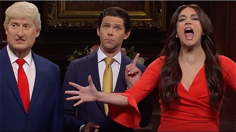 JD Vance's complicated relationship with Donald Trump has been brilliantly blasted by "SNL" on many occasions. Bowen Yang perfectly plays the vice president as the bearded good-sport-at-all-costs, trying to kiss up to the boss who treats him as an afterthought. In one sketch set at an election rally, Yang's Vance tried to shake Trump's (James Austin Johnson) hand just as the president turned away and a stagehand moved the bulletproof glass shield away from the podium. Laughing awkwardly, Yang said, "How much do you love Donald Trump? Just this afternoon, he told me, 'JD, you're like a son to me, 'cause I don't like you and I'm stuck with you.'" Despite his efforts to "[get] this crowd hopped," the audience was unimpressed, and the camera suddenly cut away from Vance — at Trump's request.