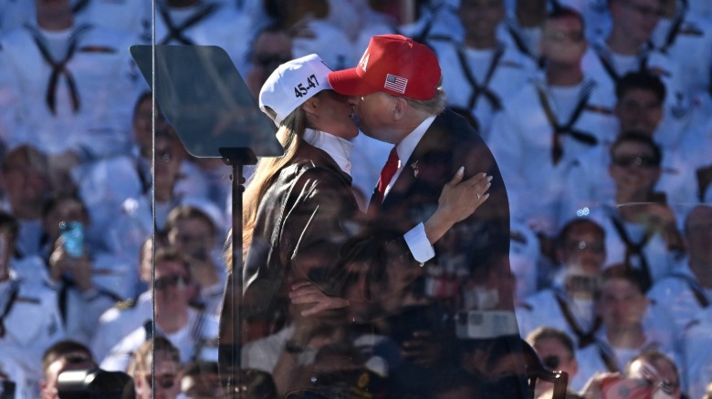 On October 5, the Trumps took the stage at the Naval Station Norfolk in Virginia to celebrate the U.S. Navy's 250th anniversary. Melania led a "hooya" chant with the audience before speaking. Donald made his own speech which, as we've come to expect, involved a lot of weirdness that included, but was not limited to, claims that he's the "healthiest" modern president. Surely no one was surprised to hear a rambling, sometimes incoherent speech from the president or to see him and the first lady in his and hers MAGA hats. What did come as a surprise, however, is that they found themselves locking lips in front of the crowd.