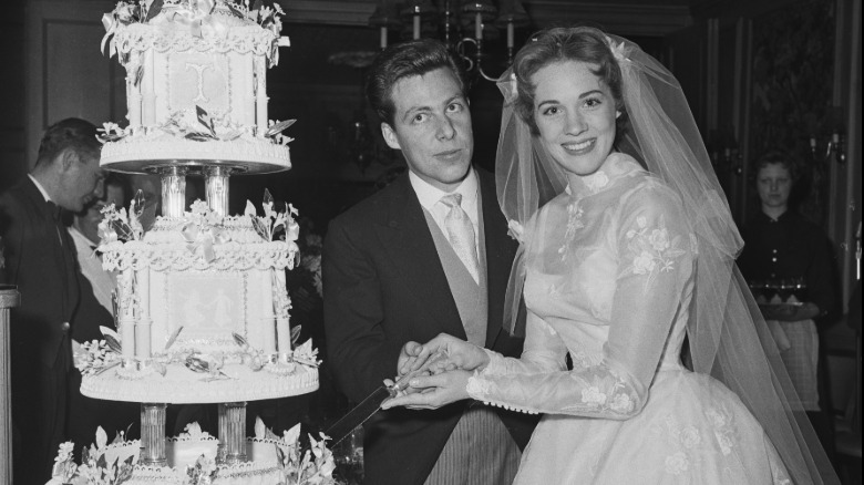 The heartwarming photo shows a joyous Andrews, beaming in her wedding dress (and the groom doubled as the dress' designer, per Tatler). The actor's stunning smile shows off her round cheeks in a full display of Andrews' beauty. Walton stands next to her as they pose alongside their extravagant, multi-tiered wedding cake, fit for such a glamorous couple. There's no denying that "The Sound of Music" star made for a beautiful bride at their 1959 wedding.