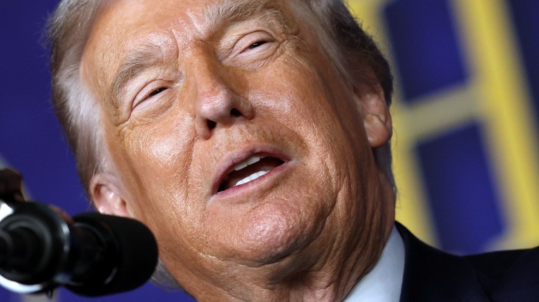 President Donald Trump recently bragged that his campaign plane only serves McDonald's, but nobody expected him to return the favor in such an unusual fashion. Speaking at the McDonald's Impact Summit on November 17, 2025, the divisive politician looked as though he'd been dunked in the deep fat fryer himself. The unfiltered photo seen below shows a definite shininess to his complexion, along with one of Trump's biggest makeup fails to date. The president sported his standard orangey foundation, but many areas were left unblended or completely uncovered, such as around his eyes, the tip of his nose, between his eyebrows, and inside his ears. It was a jarring contrast, and suggested that Trump almost certainly does his own prep work; a professional makeup artist would have done a better job of application, not to mention dusting on some finishing powder to keep the greasy look at bay.