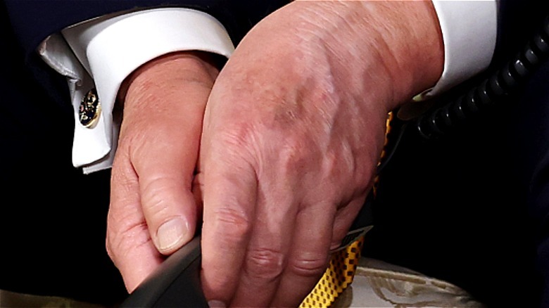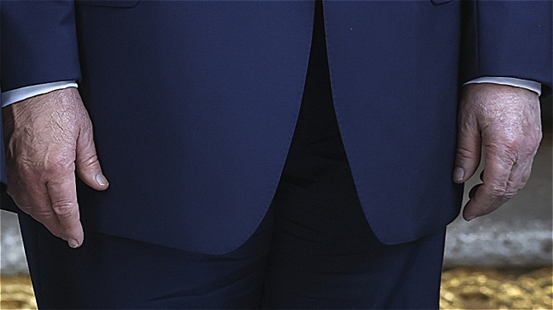 Those comments re-emerged once again on December 29, when Trump met with Israeli Prime Minister Benjamin Netanyahu. Standing for the requisite press photos, the POTUS revealed his hands in all their glory. Not only was there evidence of foundation covering the suspicious area — a lighter patch below his lower knuckles — but both of his hands were also puffy and seemed eerily waxen. Journalist and frequent Trump critic Aaron Rupar shared a photo on X (formerly Twitter), and followers agreed something was off.