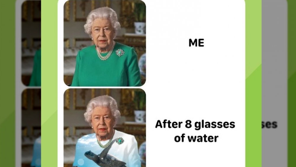 Meanhwhile, people have a lot of free time on their hands right now, and more free-time means more memes. The Queen's dress was not off limits to meme creators. The shade of green she chose to wear in order to show support was coincidentally the same shade as a green screen, making it easy for Photoshoppers to "enhance" her look with pattens galore (via Marie Claire).