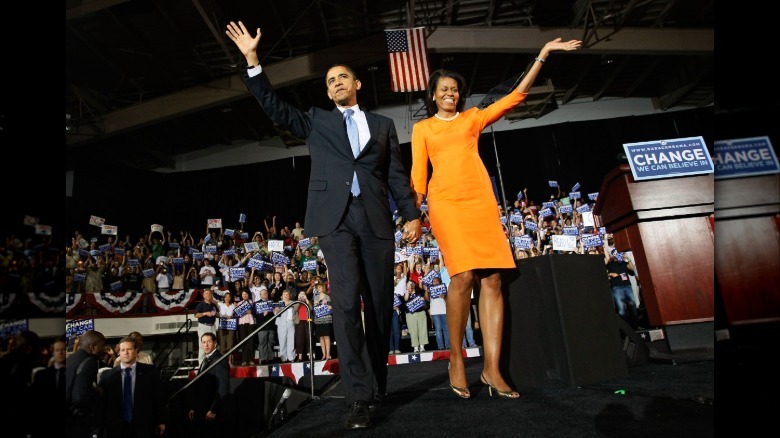 Michelle Obama had yet to become the first lady at a rally back in 2008 when she wore another dress that definitely wasn't our favorite. This orange number landed at her knees and put her calves on display.